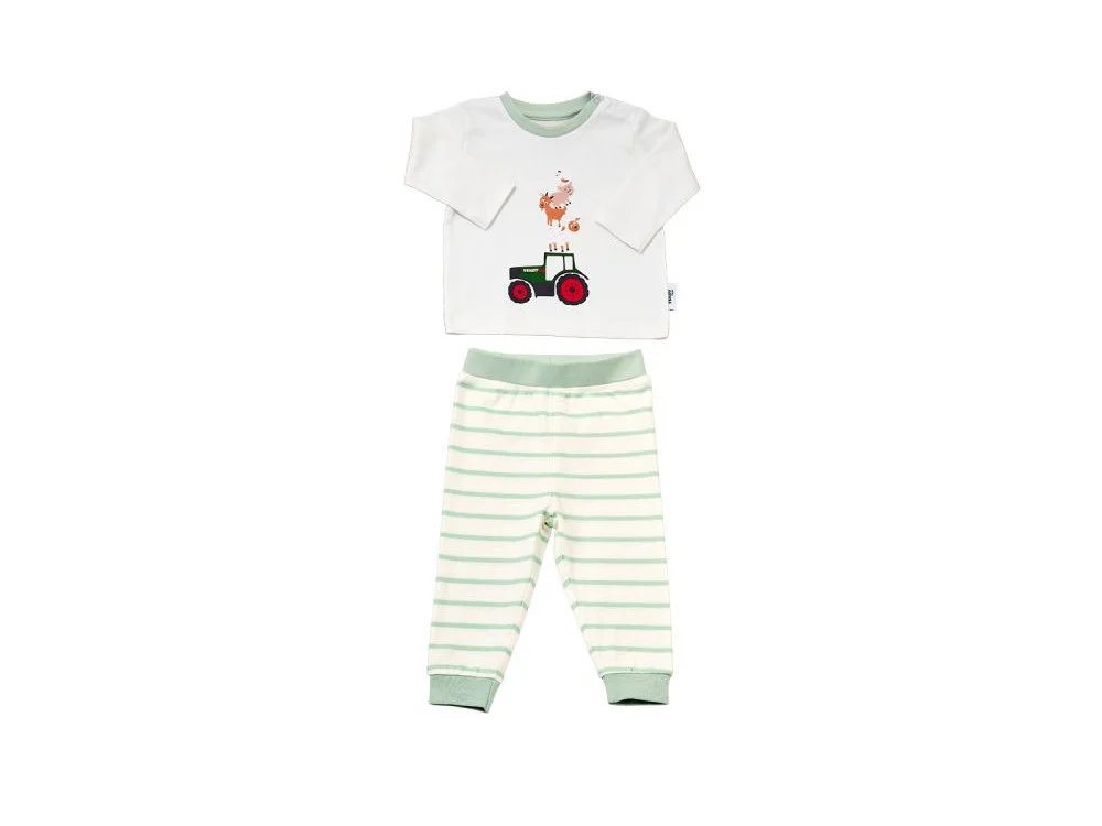 Make bedtime fun and comfortable with the Fendt Baby Pyjamas, designed to bring sweet dreams and farming charm to your little one s nightwear. Made from 100% soft cotton, this two-piece set includes a long-sleeved top featuring a playful Fendt tractor and animal print, paired with cozy striped trousers. Perfect for everyday use, these pyjamas offer both comfort and style for young fans of the Fendt brand.