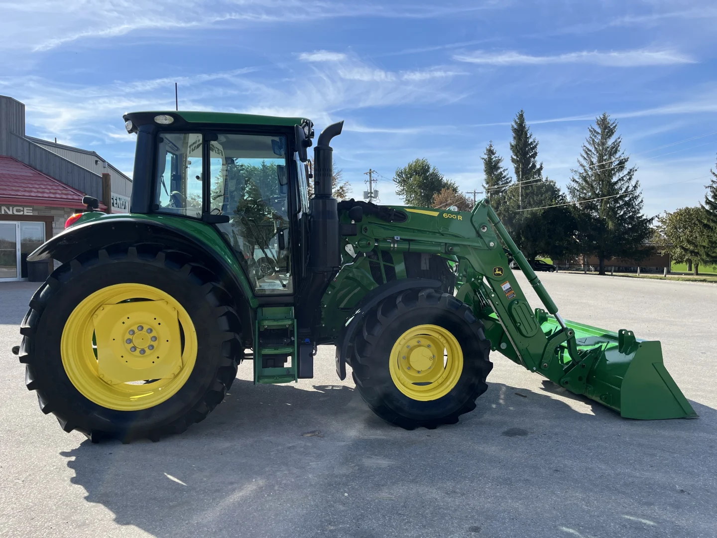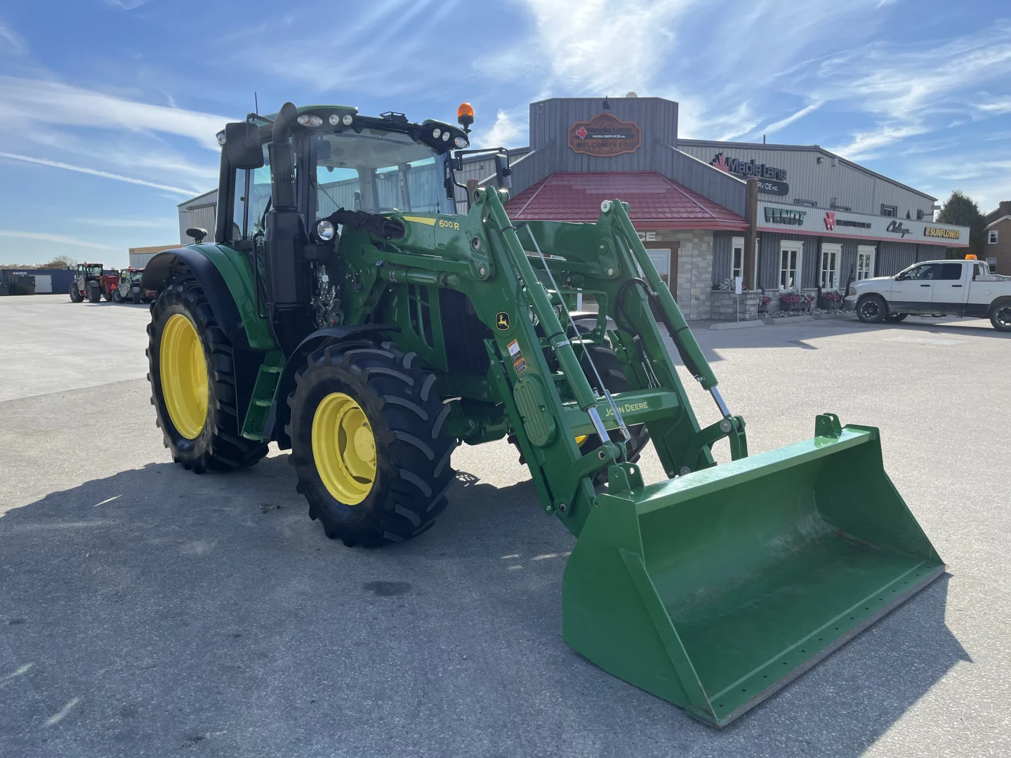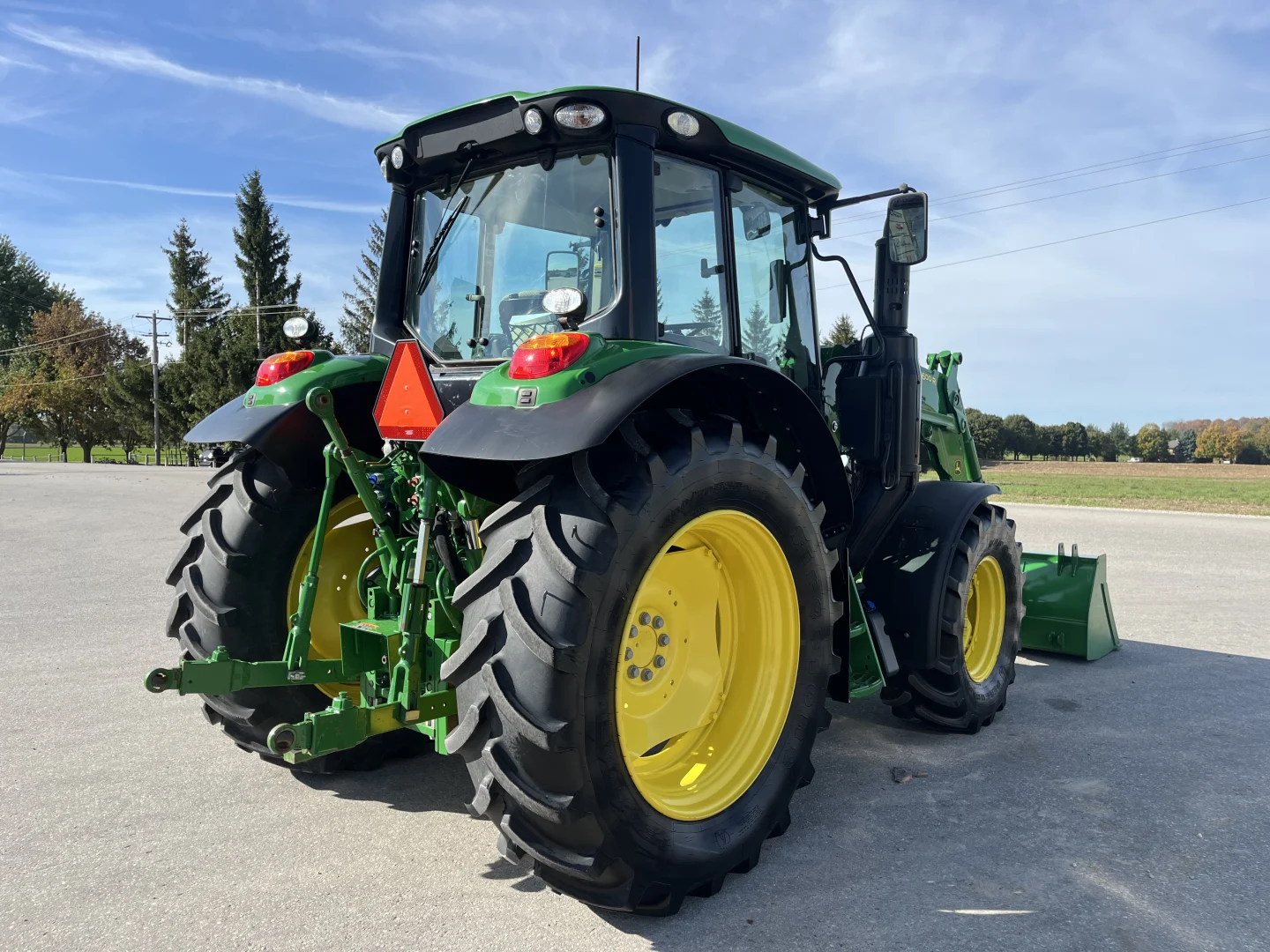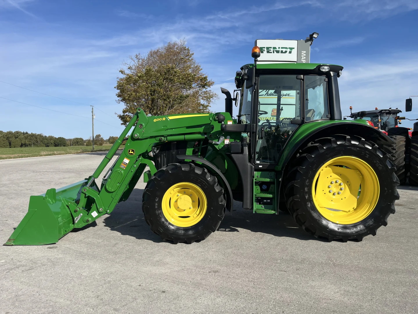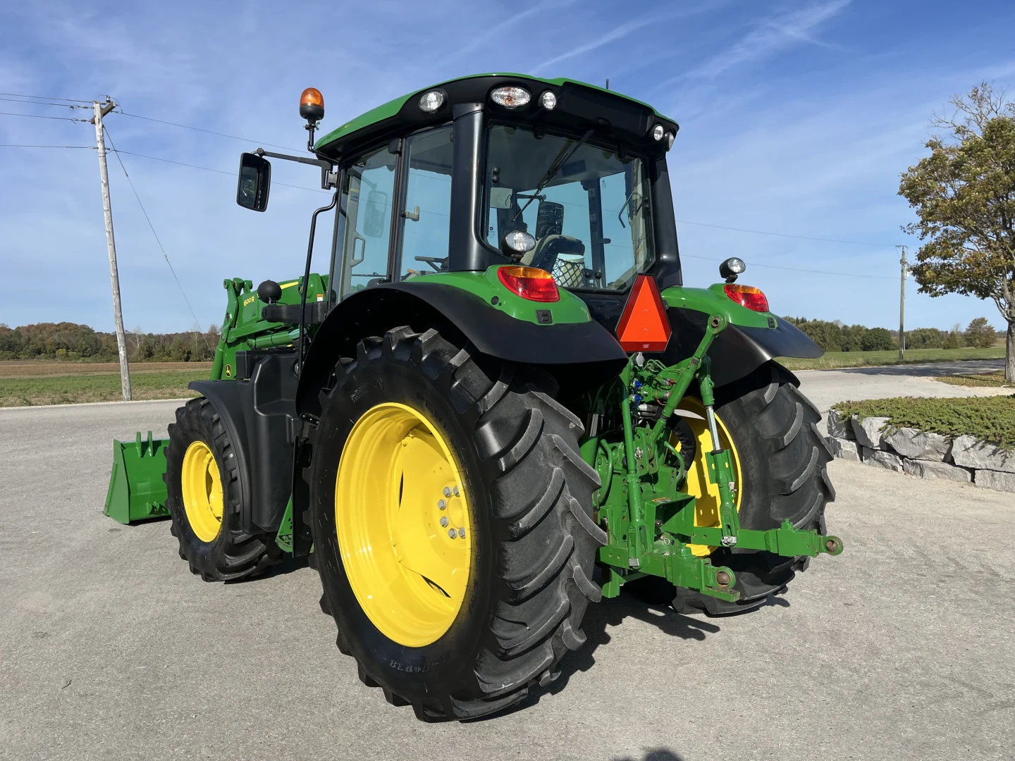 480/70R38 and 420/70R24 tires, 24-spd PowerQuad Plus powershift transmission, 3 remotes, JD600 self-leveling loader, 84″ bucket.