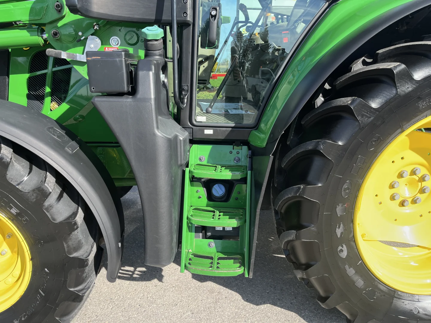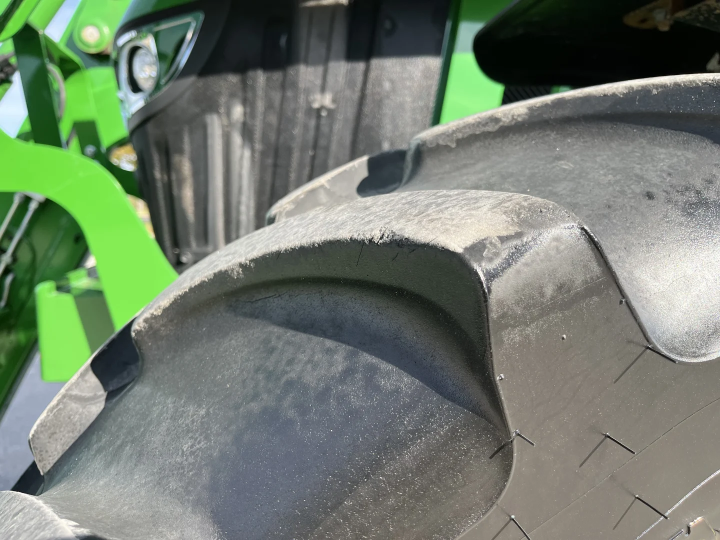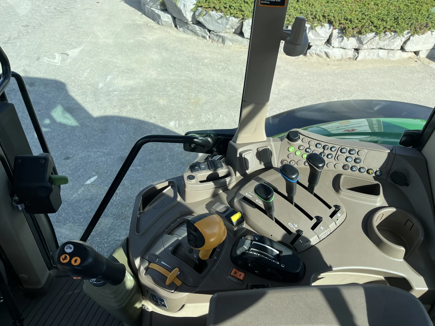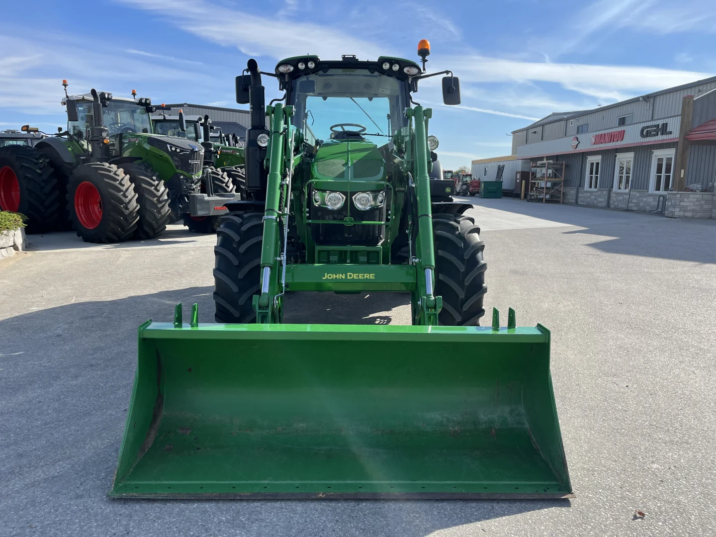 480/70R38 and 420/70R24 tires, 24-spd PowerQuad Plus powershift transmission, 3 remotes, JD600 self-leveling loader, 84″ bucket.