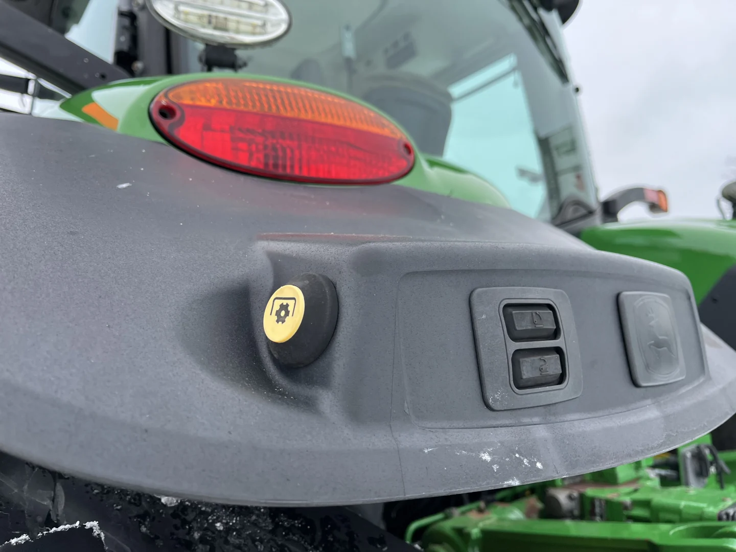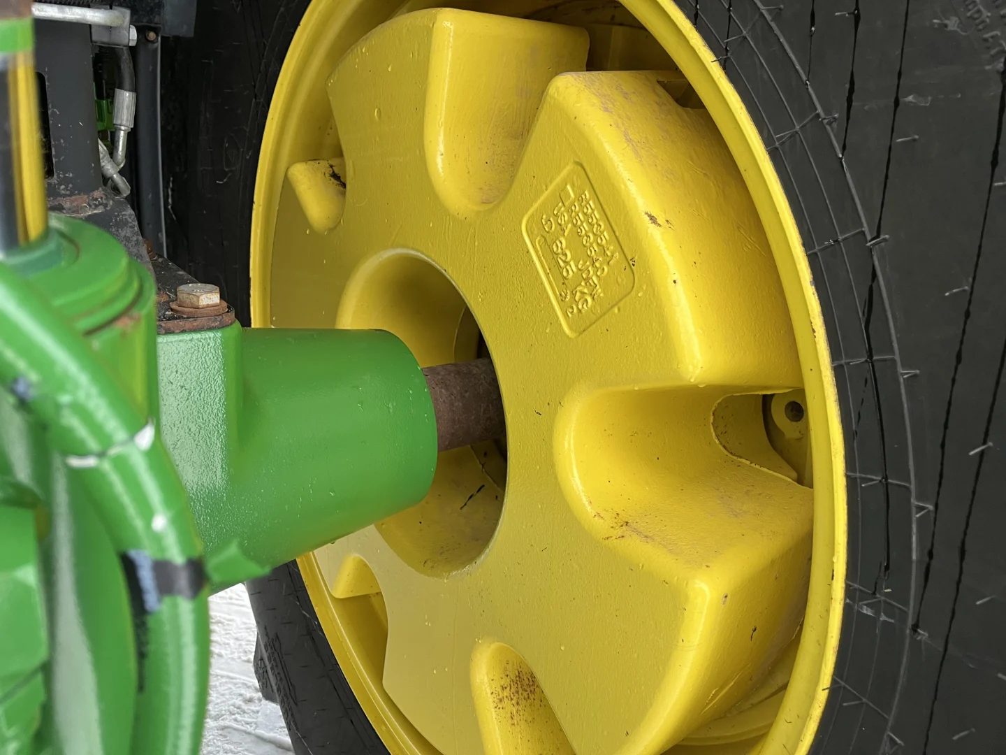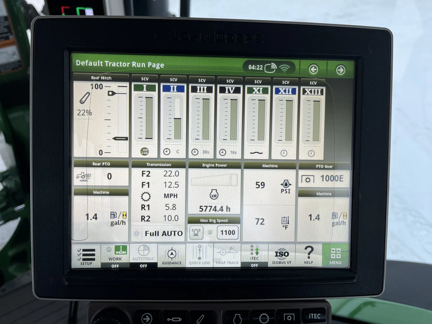 50kph IVT transmission, suspended front axle, cab suspension, IF650/85R38 and VF600/70R30 tires, 625kg/side wheel weights, H480 self-leveling loader with live 3rd function, 4 rear remotes, hydraulic trailer brakes, cloth seat, LED light package, AutoTrac unlocked, Starfire 7000 receiver available.