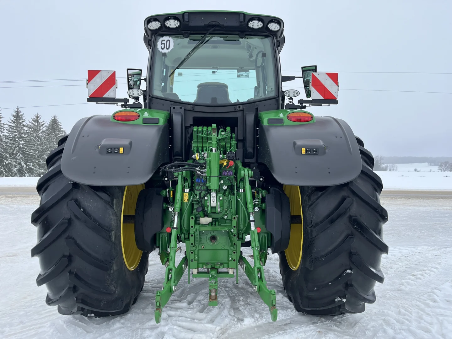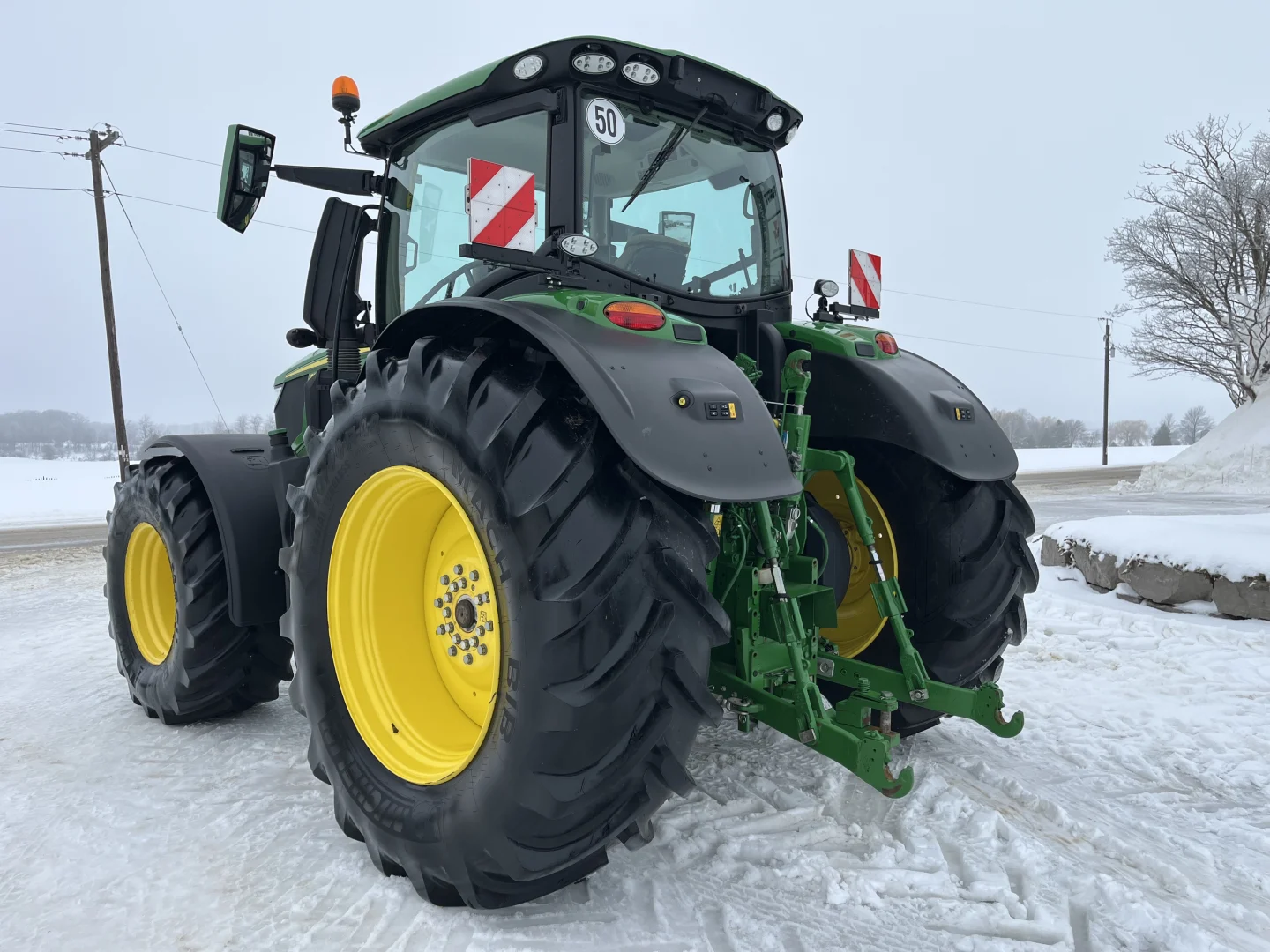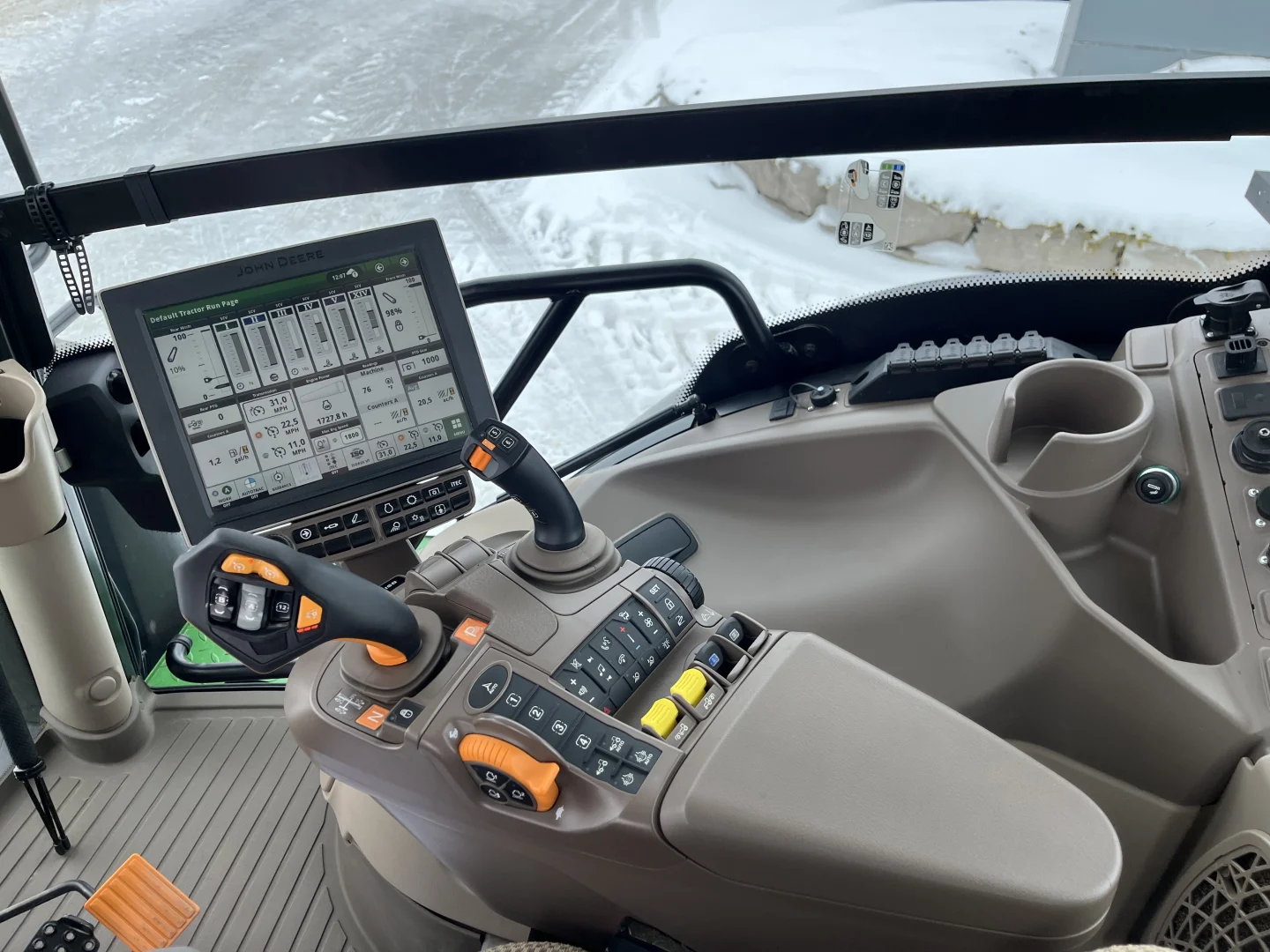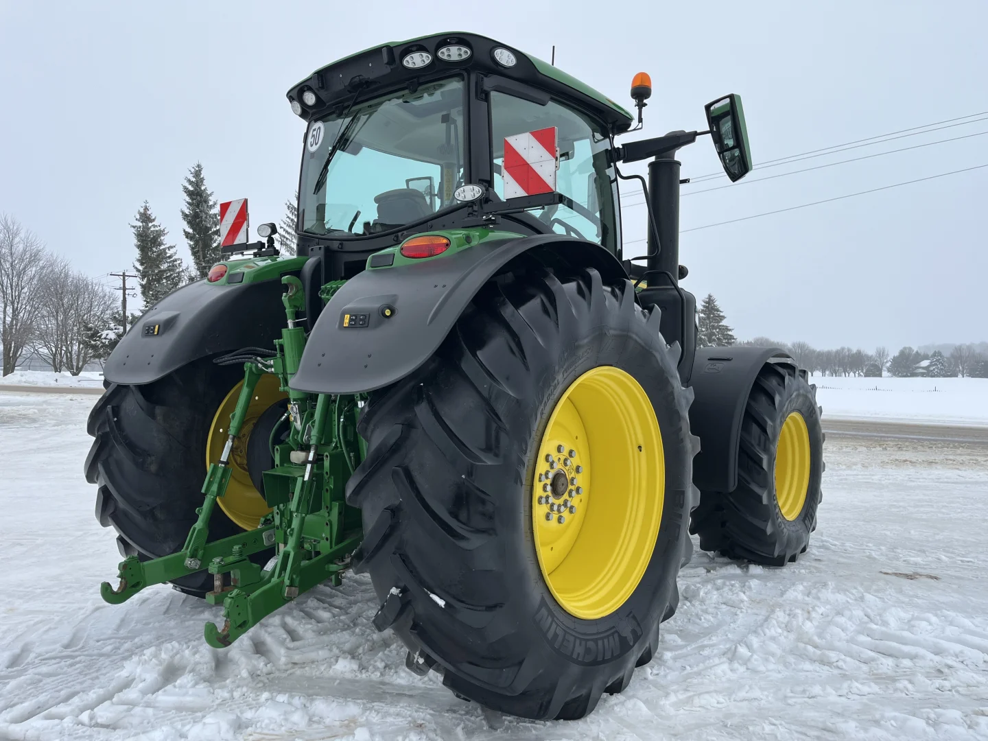50 km/h IVT transmission, Command Pro, Michelin tires- 710/70R42 rear, 600/70R30, front 3 point hitch, front PTO, 5 rear valves, cab suspension, LED lights, air and hydraulic trailer brakes, hydraulic toplink, powered and heated mirrors, AutoTrac and Section Control unlocked