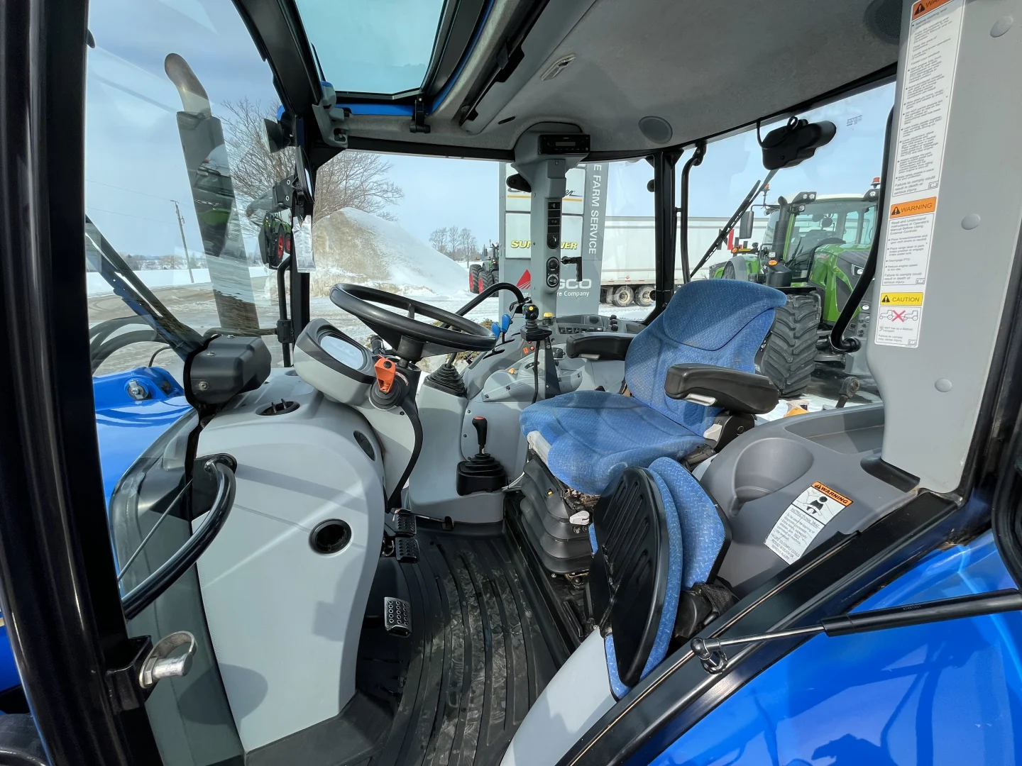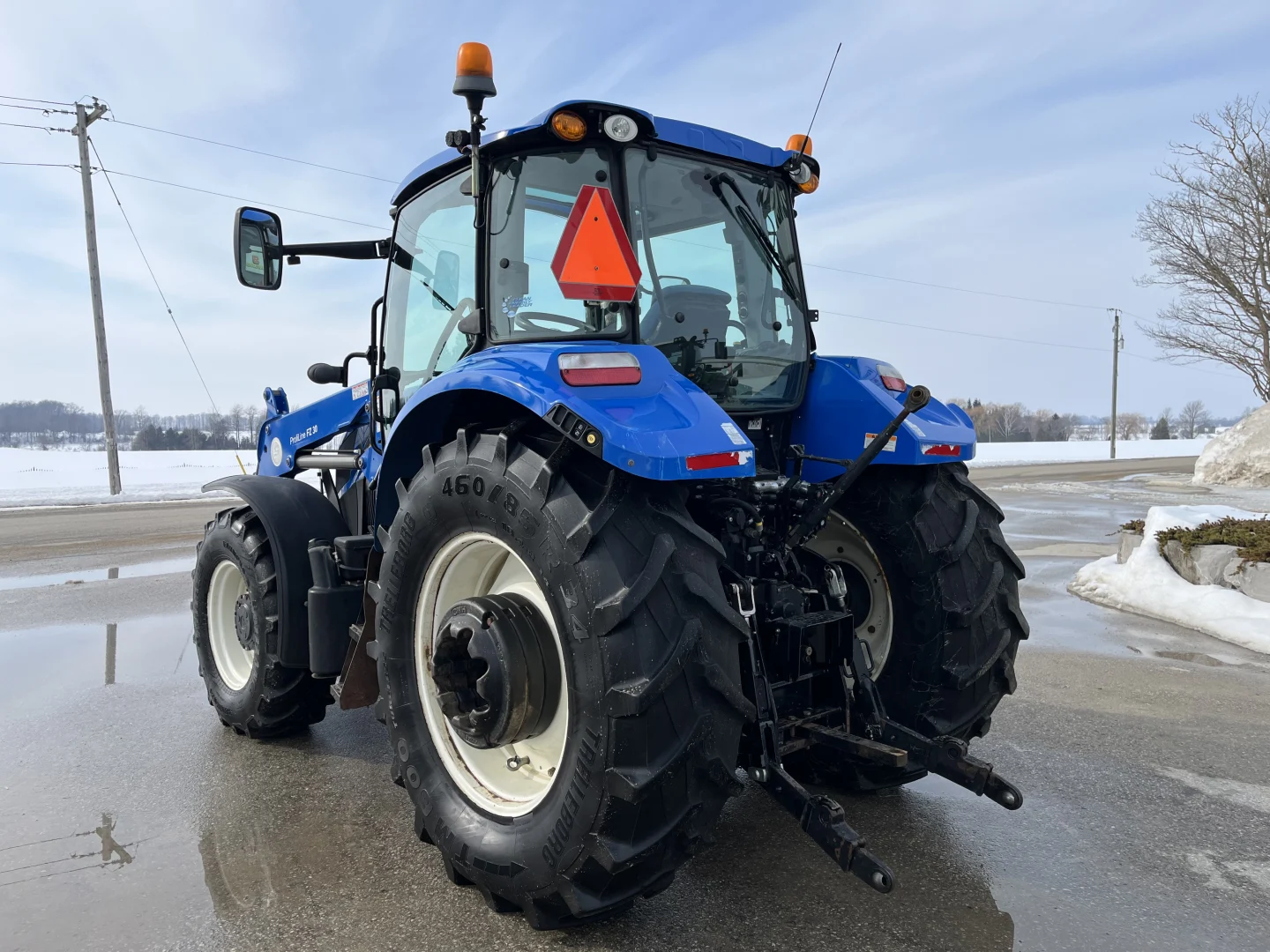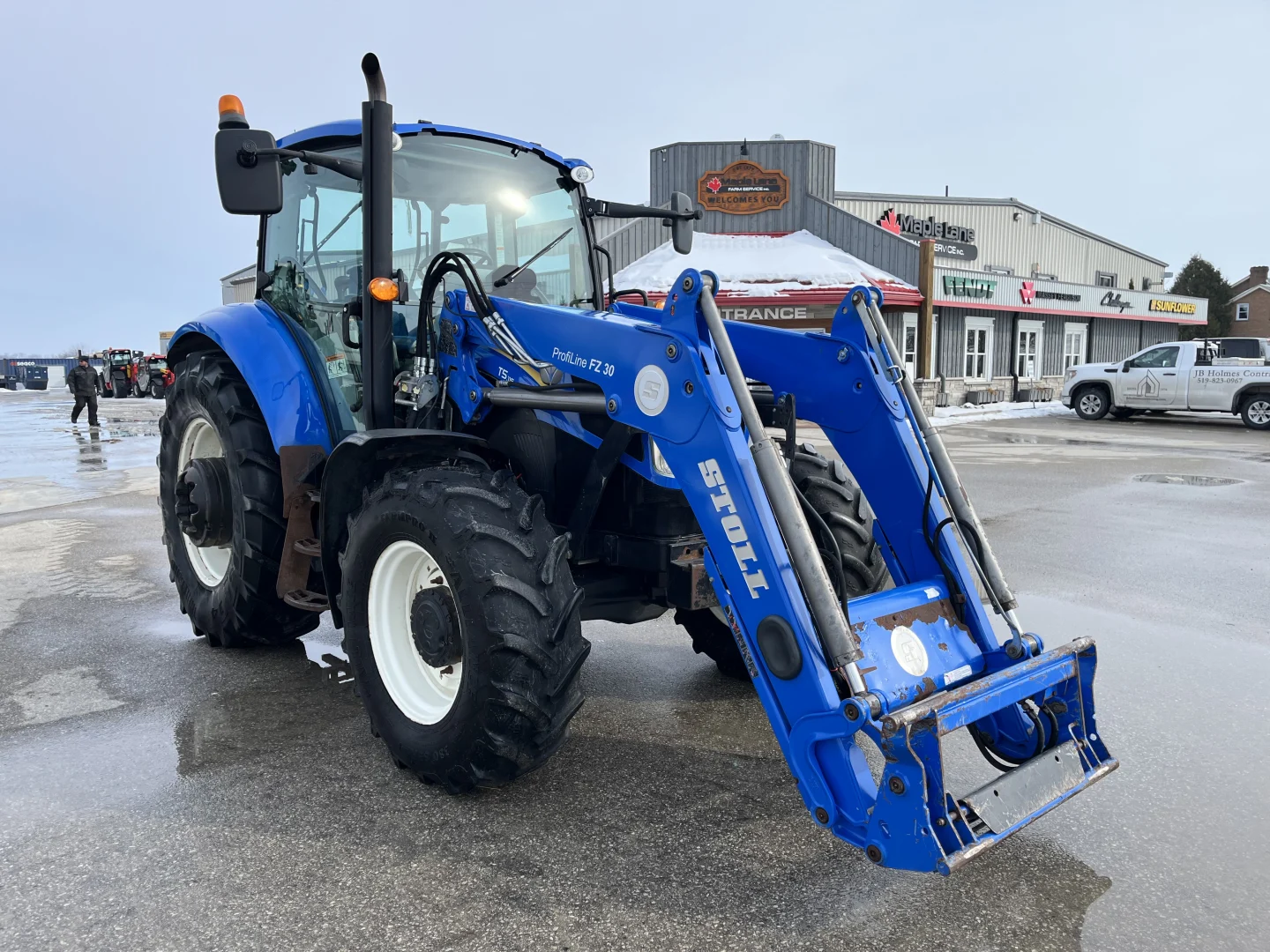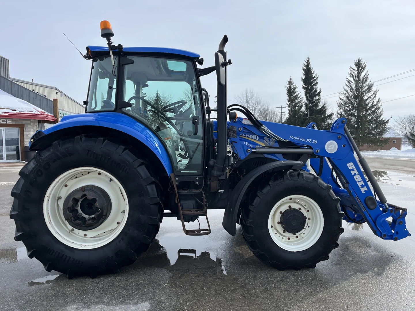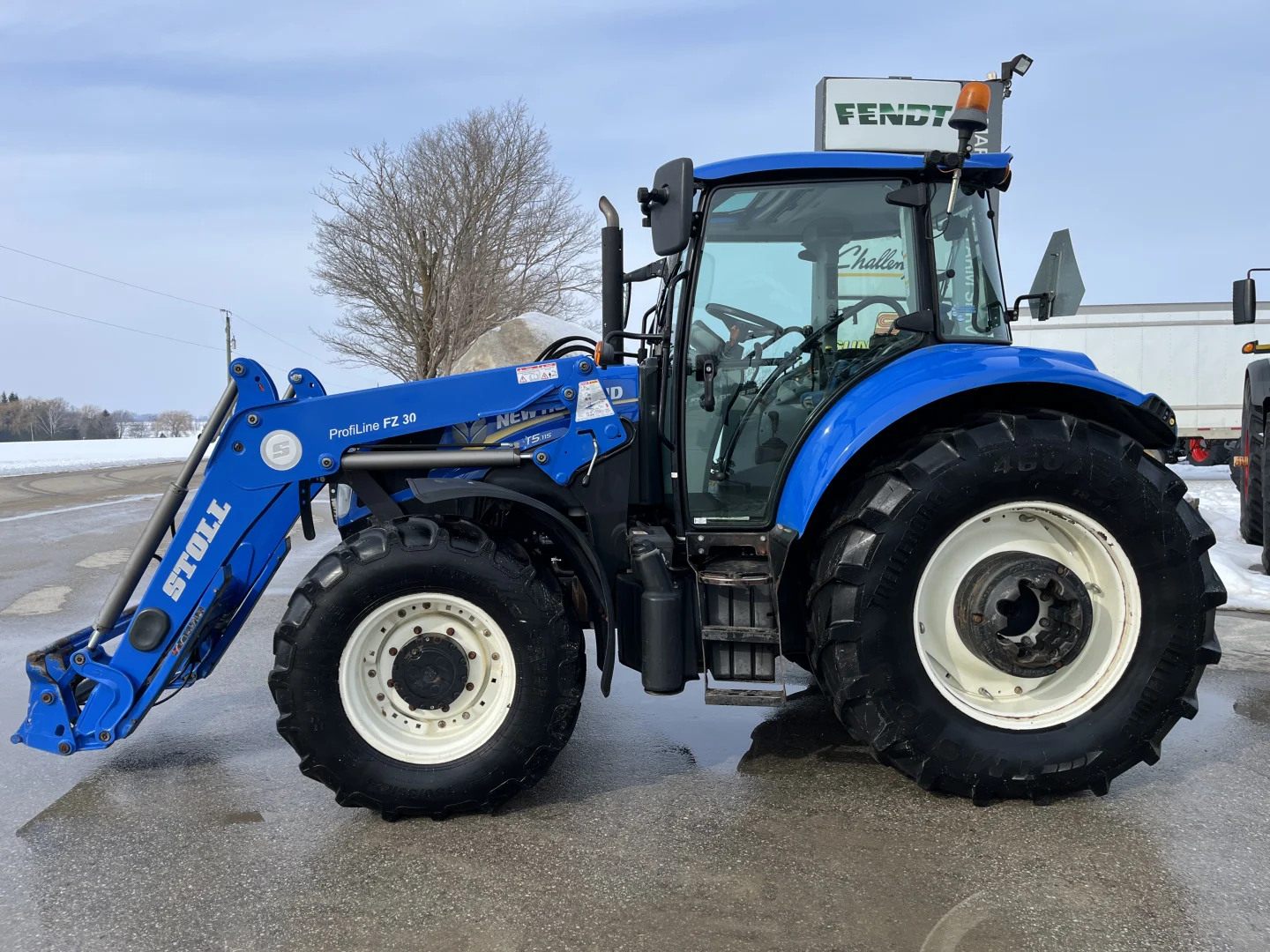 Cab/heat/air, radio, MFWD, 24-speed Dual Command transmission, Left hand reverser , front & rear wipers, cab mirrors, buddy seat, high visibility window, block heater, 380/85R24 front tires with fenders, 460/85R34 rear tires, 3 sets of 50 kg rear wheel weights, 3-point, 540& 1000 PTO, 3 sets of rear hydraulic remotes, Stoll Profi Line FZ30 self-leveling loader, Alo hook up, single-point hydraulic manifold, grill guard, arm rest joystick, dual beacons.